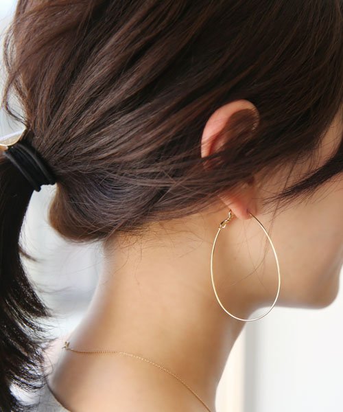 緩やかなカーブを描いたドロップフープピアス。ふんわりとした丸みが女性らしさをぐっと引き上げてくれますよ。大きめデザインがお顔周りをすっきりとした印象に。控え目な存在感でオン/オフ問わず使える優れもの。デイリーユースにおすすめなアイテムです。