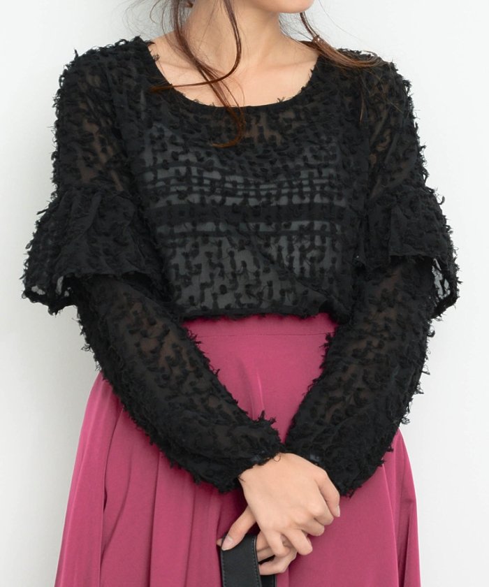 シアーなシフォン生地にフリンジデザインをあしらったデザイン性の高いトップス。
