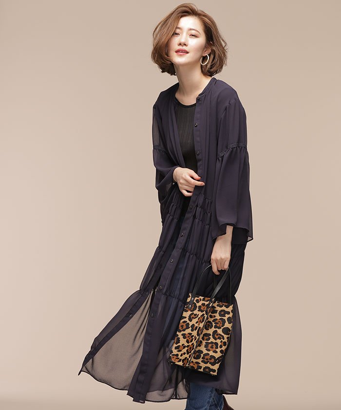 流れるようなシャーリングが美しいワンピース。フレアーに広がる袖が女性らしさを引き立て、薄手のシフォン生地が軽快な着こなしをアシスト。フロントボタンを開けてシンプルな装いに羽織ればレトロヴィンテージ風な着こなしに。キャミワンピースをインナーに着て透け感を楽しんでも◎。
