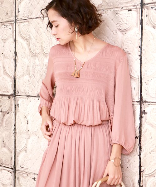 同素材のタックワイドパンツ(571913)と合わせていただくと、セットアップとしてドレスのようなエレガントな着こなしとなりますし、ボトムスをお好みで合わせて頂くとお仕事着としてもご使用いただけます。